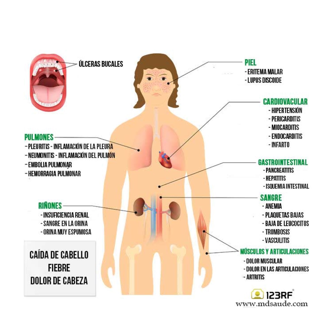- Erupciones cutáneas: Una erupción en forma de 'mariposa' se desarrolla en casi la mitad de las personas con LES. La erupción se ve mayormente sobre las mejillas y el tabique. Se puede generalizar. Puede empeorar con la luz del sol.